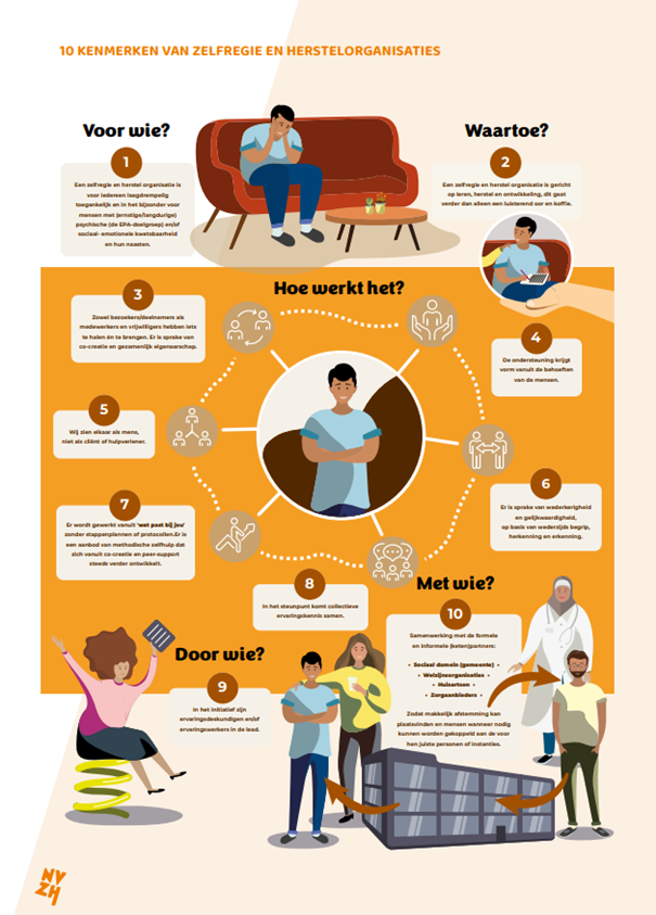 Het document “Rollen en functies in zelfregie- en herstelorganisaties” van Stichting Zelfregie biedt een mooie verdieping op dit thema. Het laat zien hoe verschillende rollen in de praktijk ontstaan, in elkaar overlopen en samen de basis vormen van een sterke, door ervaringskennis gedragen organisatiecultuur. Het document staat vol herkenbare voorbeelden en helpt om het gesprek te voeren over groei, rolontwikkeling en eigenaarschap binnen laagdrempelige steunpunten.